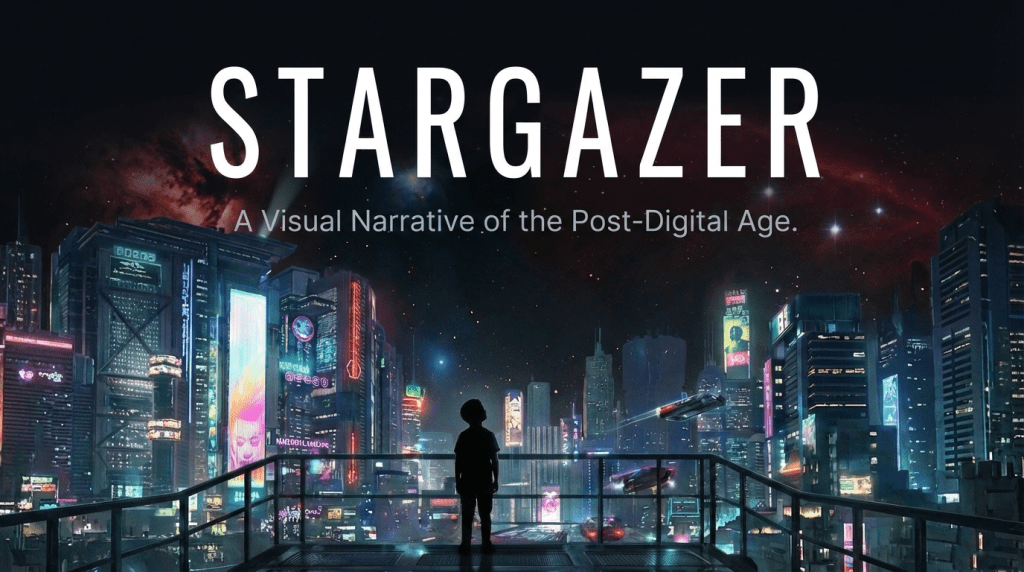 A close-up profile view of a child’s face, covered in glittering, cosmic dust. The child looks upward with a pensive expression, their hand touching their chin.